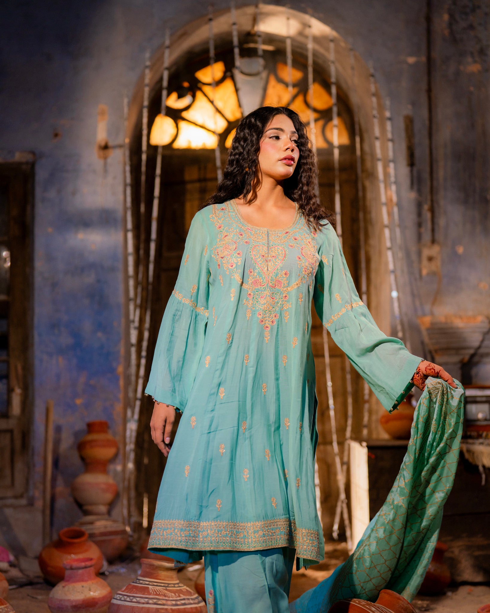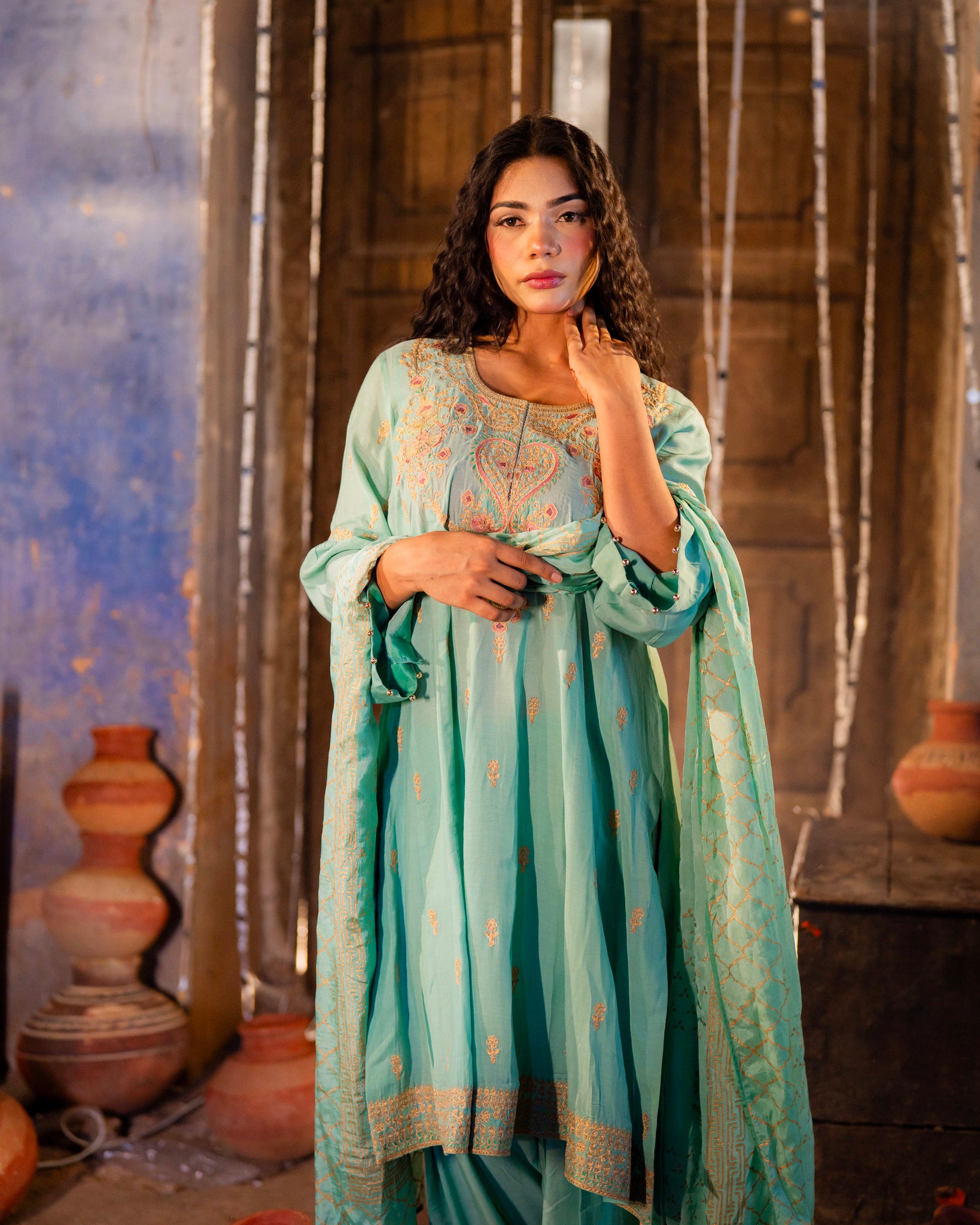 Heavy muslin fabric with dori and resham work